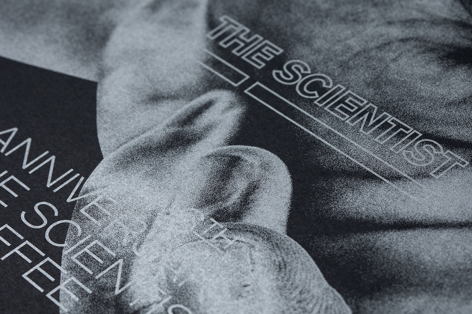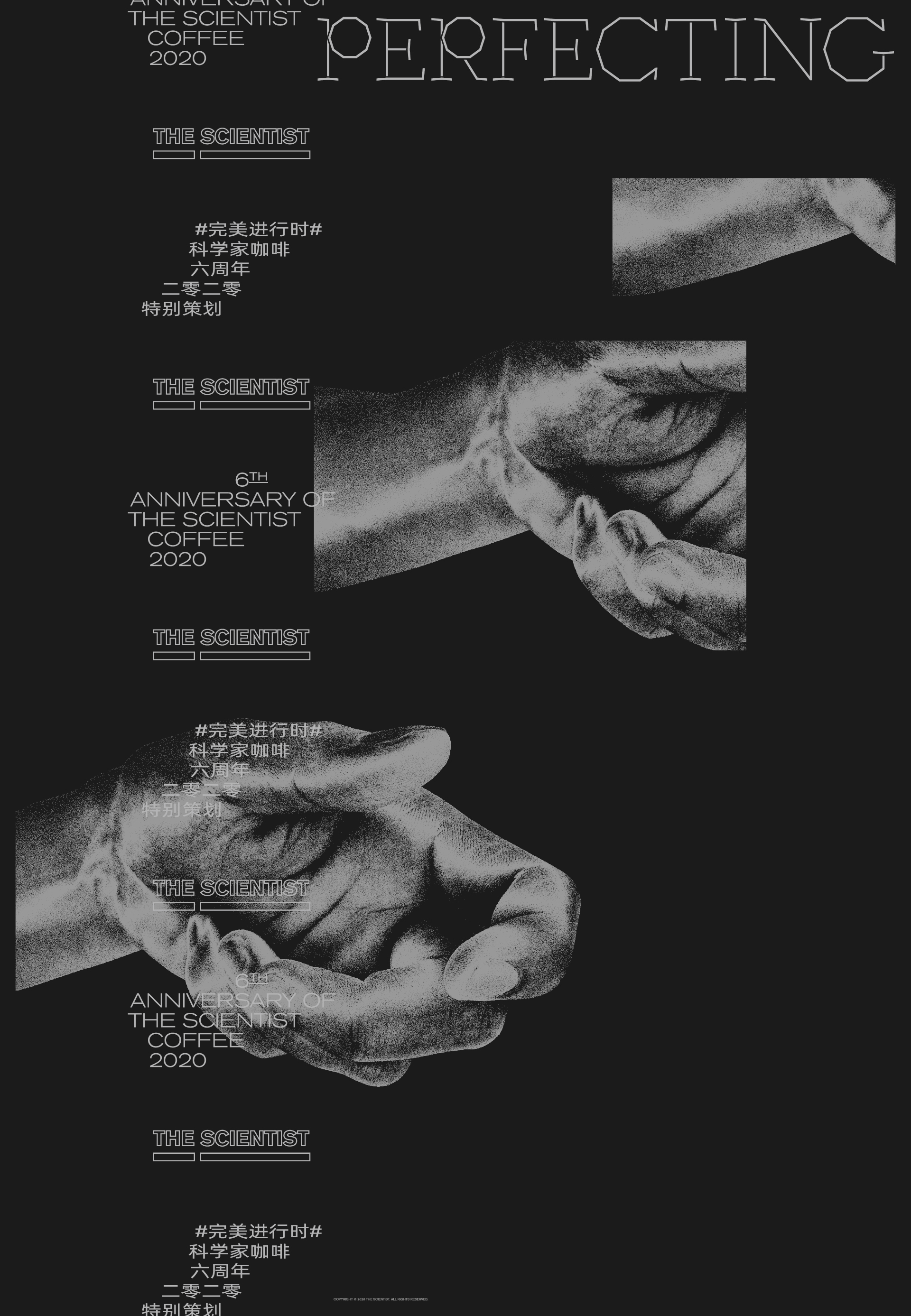 「完美進行時」(Perfecting)是科學家咖啡六週年周邊產品推廣的主題。在主題海報的設計中,我捕捉了咖啡製作過程里最具代表性的三個步驟,並將這些步驟中人手的狀態作為主要元素,通過對手的圖像和主題文字進行裁切和網格化的編排,表現出始終在追求完美的運動狀態,傳達了品牌精益求精的態度;海報圖像中的顆粒感、銀色油墨的光澤和黑色卡紙的質感呼應了這一主題對永恆和經典的藝術化表達。海報中的元素也都應用在了這一季周邊產品的設計中。