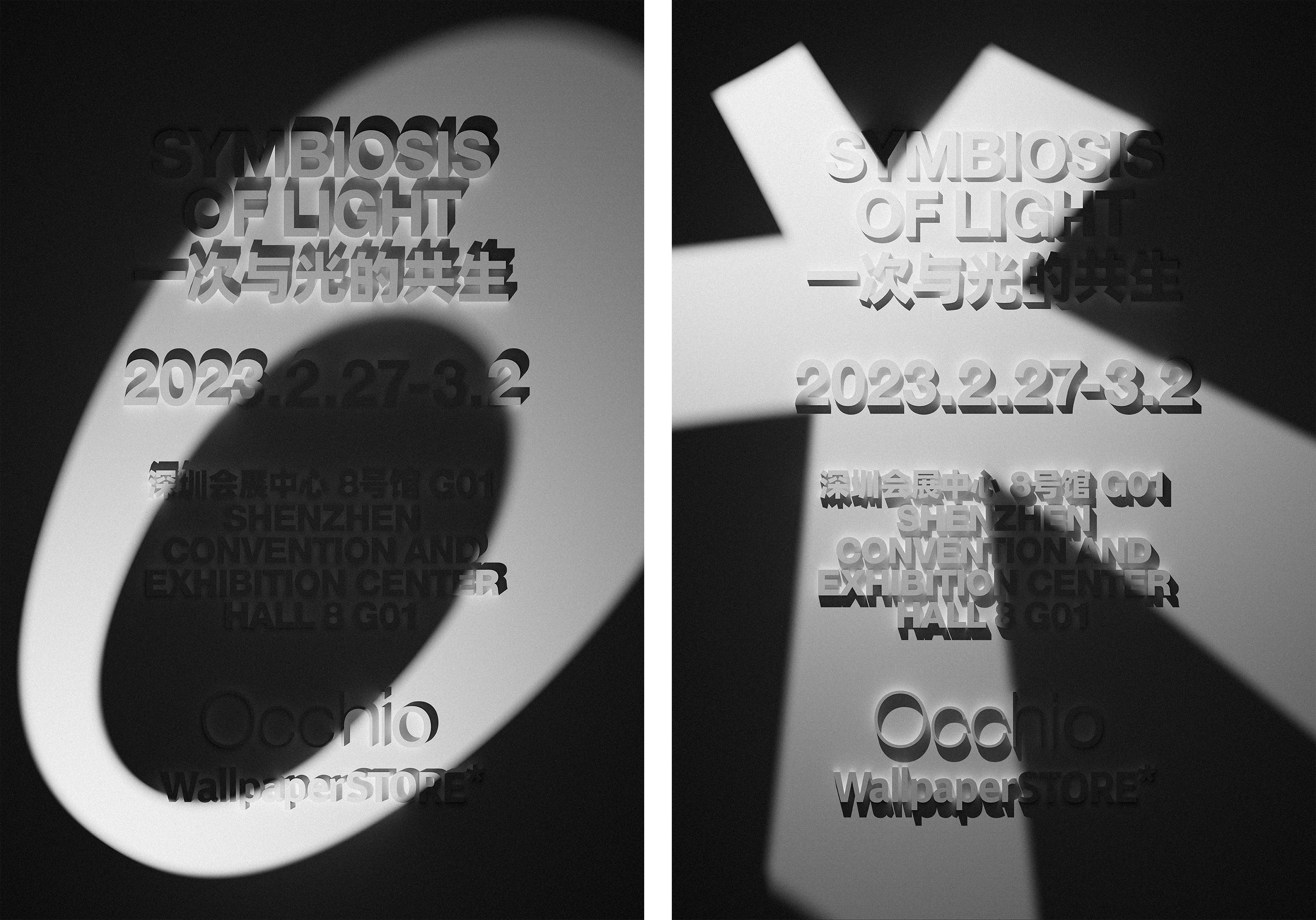 這是我們為德國奢侈品燈具品牌Occhio和WallpaperSTORE*的聯名展覽設計的海報,主題為一次與光的共生。海報分為預告版和正式版,我們將聯名雙方的品牌元素、展覽信息結合產品特征,用光影的形式進行表達,以光與影交互的極致視效體現展出內容的格調,並呼應了共生的主題。