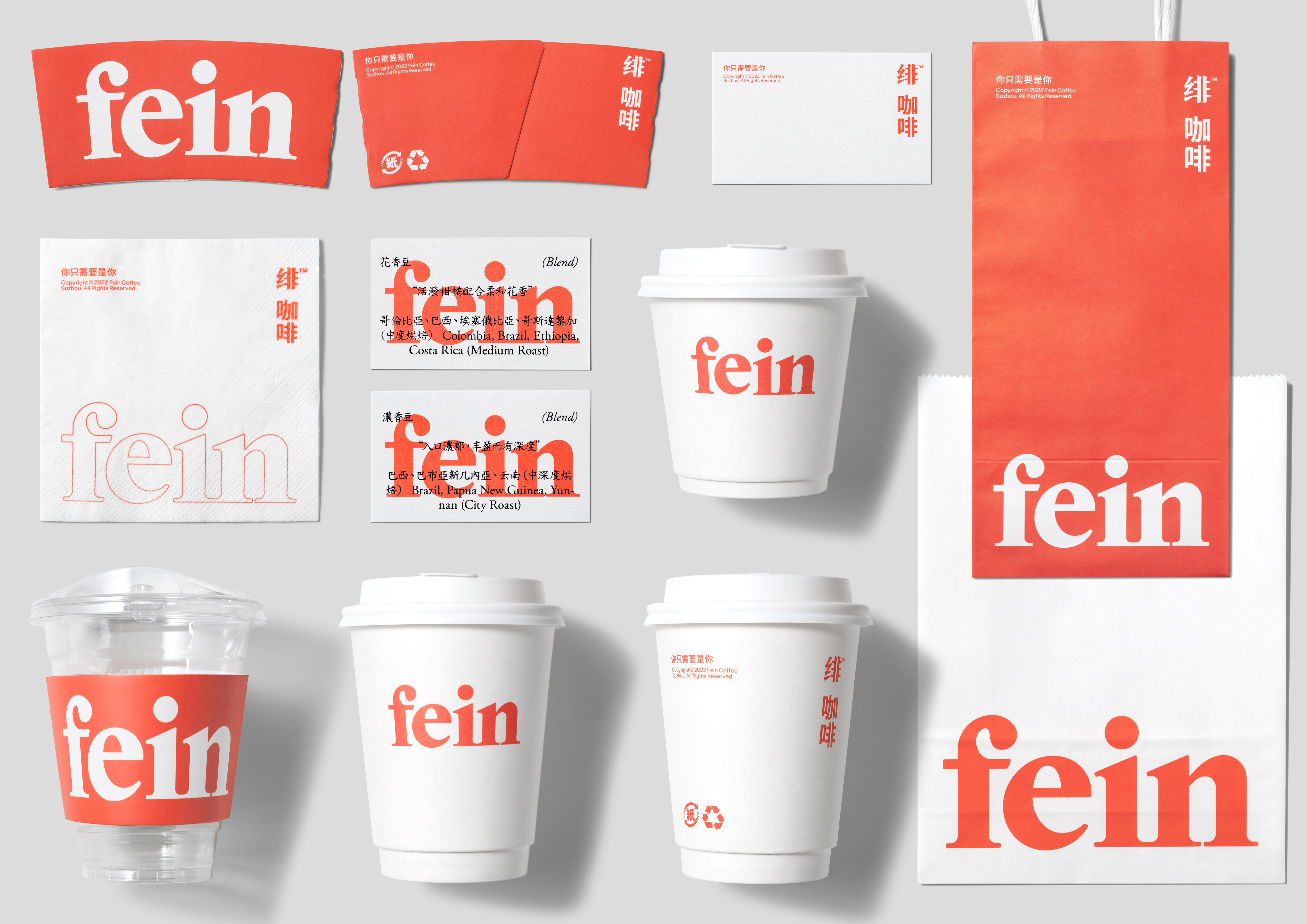 緋咖啡是一個誕生於古城蘇州的連鎖咖啡品牌,品牌以女性視角出發,傳遞溫暖與關懷,並主張獨立且精致的生活態度。我們從品牌名稱Fein切入,通過高易讀性的襯線字體設計,讓其成為一個親切又自信的宣言,在社群中傳播。為了兼容品牌的江南地域特征和產品的外來屬性,品牌的視覺系統通過固定結構的設置,讓豎排版的中文標誌、橫排版的英文標誌、人文古樸的文本和不同的圖像和諧相融。